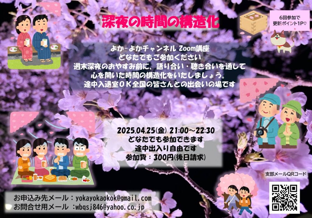 週末の夜、九州支部だけでなく他の支部の仲間たちとも集まり、おしゃべりをしながら情報交換を楽しむ時間です。
